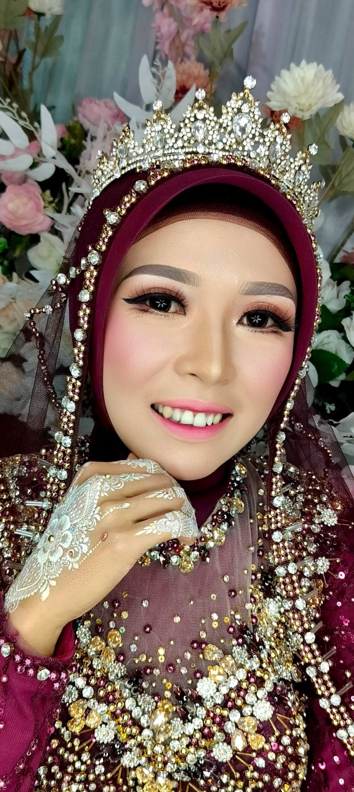 Momen istimewa Audina di hari akad dan resepsi dipenuhi dengan keanggunan dan sentuhan keindahan yang elegan. Henna berwarna putih lembut menghiasi tangan mempelai, menyatu harmonis dengan busana maroon berhias payet emas yang megah.